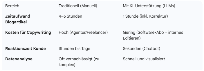 Für KMU bedeutet das: Sie haben quasi einen „virtuellen Marketing-Assistenten“, der 24/7 arbeitet, niemals müde wird und über das gesammelte Wissen des Internets verfügt.